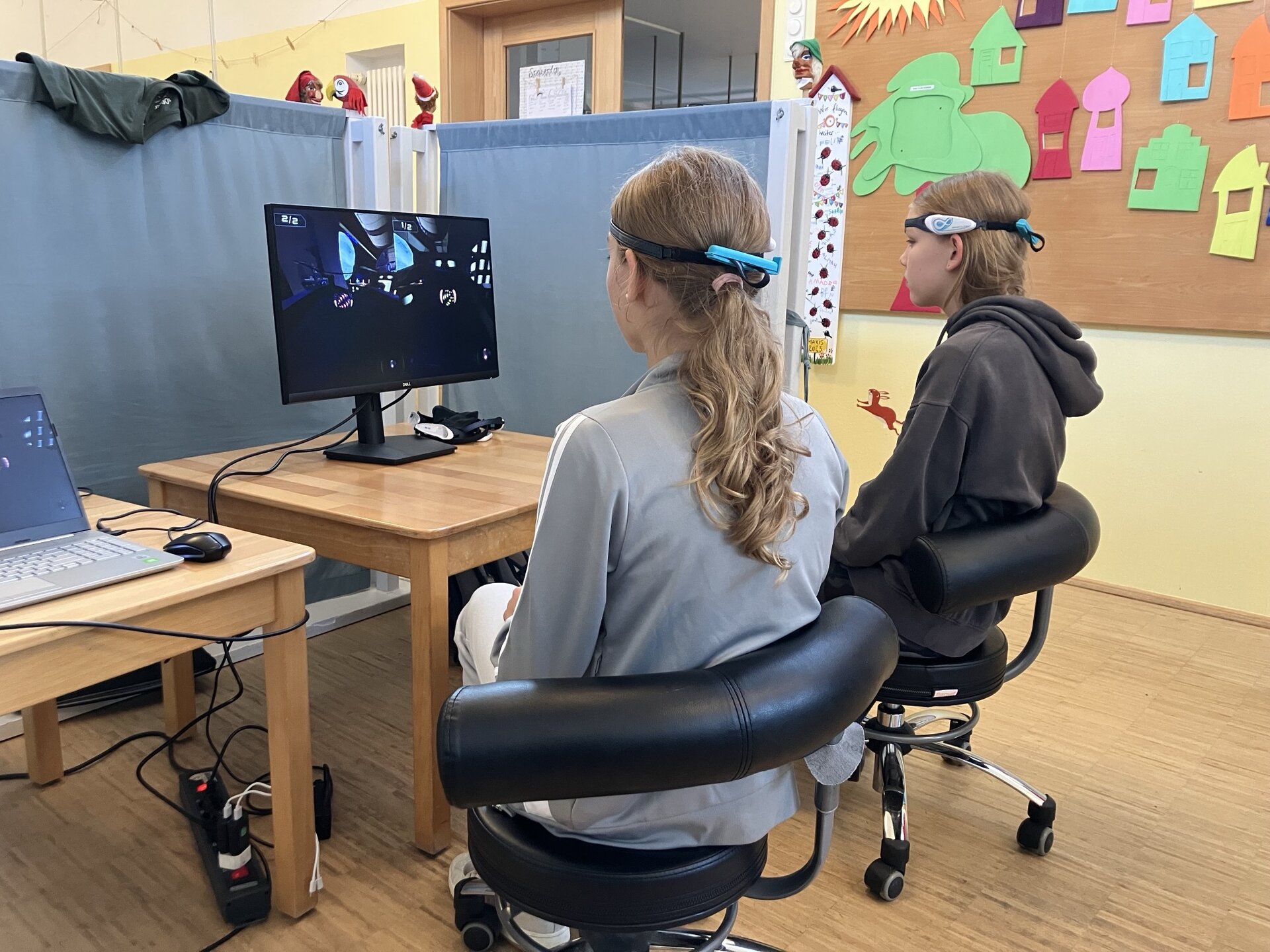 Die Kita Biberburg Albersloh stellte ihre Räumlichkeiten als eine von 30 Spielstation zur Verfügung. Die Jugendlichen erlebten auf eindrucksvolle Weise, wie sich ihre eigene Gehirnaktivität durch „Gedankensteuerung“ sichtbar und erlebbar machen ließ. Über ein Headband wurden in Echtzeit die elektrischen Spannungen (Gehirnwellen) im Gehirn gemessen und auf einem Monitor visualisiert.
